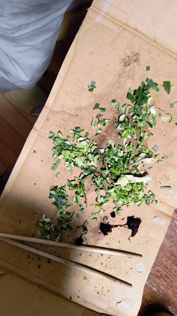 今日の好気性微生物のエサは、キャベツ(外の青い葉)とネギの葉っぱ(白ネギの青いところの先から1センチぐらいのみ)とごぼうの皮。(軽く水切りしたもの)