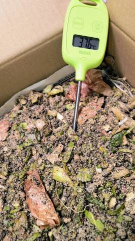 実は!昼間に、発酵不足という状況を、見てしまったので、糠で喝入れとともに、多分水分過多と思い、揉み込んで乾燥、ダンボー箱交換(前のは乾燥させ!またつかう。)を行ったのでこの温度まで発酵が継続しています。あと、窒素不足を、多少疑っているので、油かす投入、とかも検討中なのですか、gとかの発生リスクもあり、踏み切れないでいます。窒素の多い化学肥料をいれるのもアリかな。
