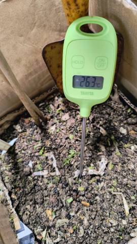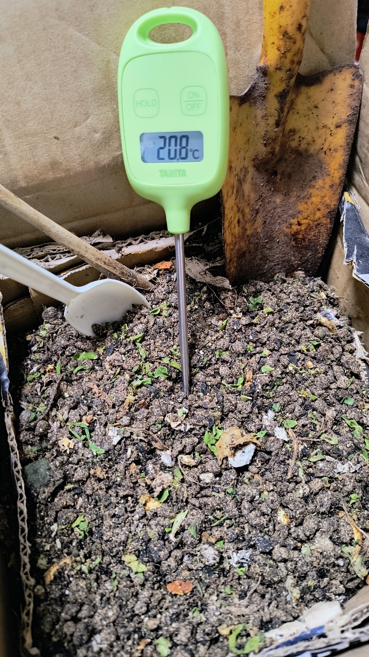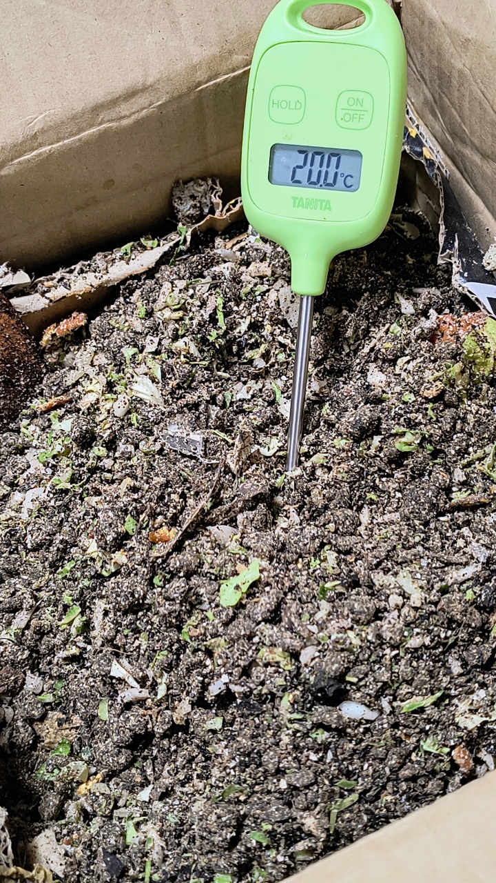 昨日入れたキャベツとミカンなどが、ほぼ分解されていない。温度も20.8℃で、室温より少し高い程度で、ほぼ発酵していない状態だと思う。