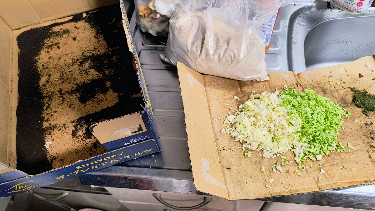 最後の晩餐は、キャベツの芯のみじん切りと、キャベツの外葉のみじん切りと、1回分のおちゃっぱと、ある程度乾燥した1回分(5杯ぐらい)のコーヒーかすで、200gと、ぬかが、50gで、合わせて250g