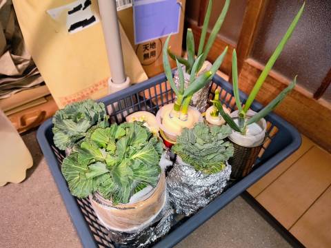 大根は、根がはえないのて、観賞用。キャベツは、土に植える予定。ネギも、食いまくった後!土に植える予定。